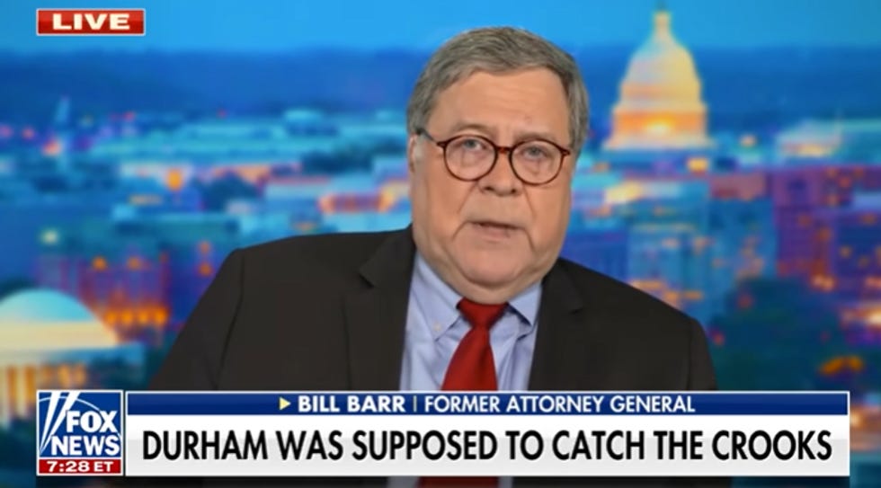 Now, as the credibility of the Durham investigation lay smoldering — not that it had much credibility to begin with — Bill Barr has weighed in. And because at heart he is just your Fox News-swilling rightwing moron uncle and you hate him, he regrets nothing. He's also still lying a lot.