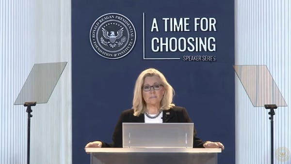 Liz Cheney spoke at the Ronald Reagan Presidential Library in sunny California last night, and because this is the bonkers world we live in, we have to treat that like a good thing and an inspiring thing. And the thing is, it was! It was good and inspiring and she stood up for America and we still have whiplash from all of this, to be honest.