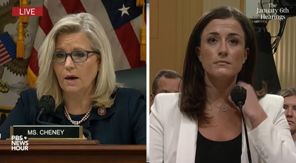 Cheney made a point at the end of the Cassidy Hutchinson hearing of showing statements from witnesses about how Donald Trump and Company had tried to tamper with their testimony, but she didn't say who. And now here comes CNN reporting that oh yeah, Trump tried to fuck with Hutchinson's testimony specifically . They say Punchbowl got it first but we're too lazy to go look. Point is, it had not been reported that they tried to witness tamper Hutchinson specifically .