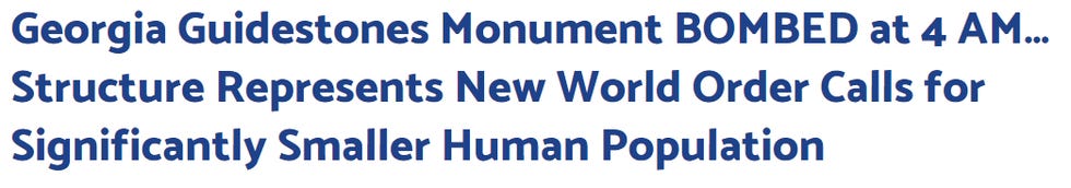 Does the phrase "somebody blew up the Georgia Guidestones" make any sense to you? Probably not unless you are a bugfuck conspiracy theorist, or if you follow them for a living. But please understand that bugfuck conspiracy theorists think you know about this, and they think you are extremely upset about it, so play along, OK?