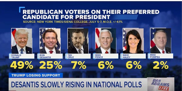 Fox News viewers prefer Trump to DeSantis 62 to 26 percent. That gap shrinks to just 16 points among less brainwashed Republican voters. Of course, the Times has an annoying habit of treating Trump like a normal candidate. His open embrace of political violence could make directly challenging him in a primary unwise for candidates who want to remain healthy.