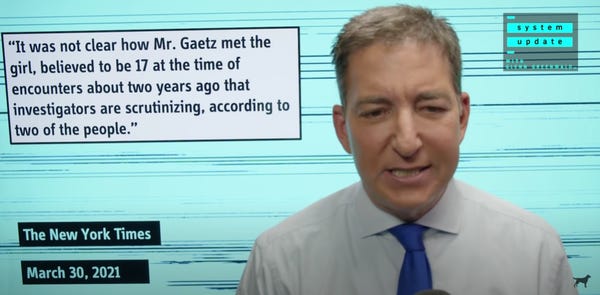 And Glenn Greenwald says that's right, Matt Gaetz doesn't hate gays like Glenn Greenwald, he just loves his stupid juvenile views on federalism more. Which tells you a lot about what Matt Gaetz would piss on should it catch on fire, and also tells you a lot about Glenn Greenwald's sense of his own human dignity, that he's OK with Matt Gaetz's choice. Keep going, Glenn.