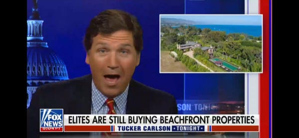 TUCKER CARLSON: Here's one of Barack Obama's beachfront compounds. As you can see, it's now underwater. But wait, it's not underwater. Actually, it's fine. And Obama knew it would be fine. In fact, Obama spent more than $10 million to buy it and that tells you how much he believes in global warming: not at all, it turns out. Actually, no one really believes in global warming and that's why all the liberals in the United States live on the coasts, because they don't believe it. That's why many of them fly private, because the entire theory is absurd and they know it. So be more like a dog. Ignore what they say, watch what they do. Watch the real estate they buy, see if you can find Al Gore flying commercial ever. You can't. Because the whole thing is a joke.