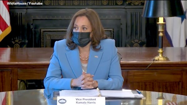 “"I am Kamala Harris, my pronouns are she and her, and I am a woman sitting at the table wearing a blue suit."”
