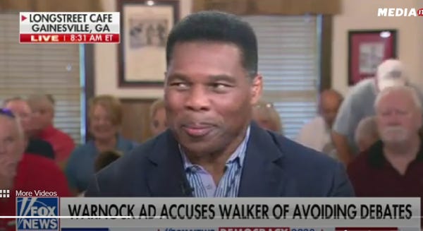 Brian Kilmeade's question was why Herschel Walker will not "commit to a debate" with Raphael Warnock . It is possible Herschel Walker is not clear on which man in that question was which. (Click over to stinky Mediaite if you want to watch the video. Also thanks to blessed Mediaite for transcribing.)
