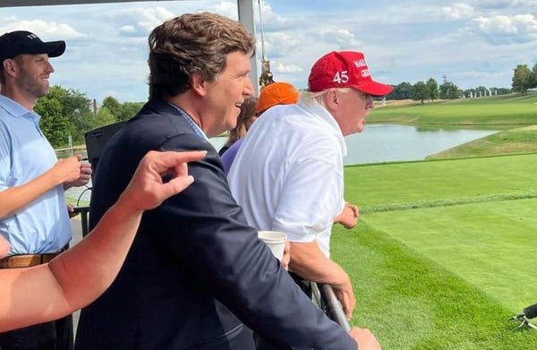 First of all, known golf gods Tucker Carlson and Marjorie Taylor Greene were there,so you can imagine Bumble was lit UP with half of New Jersey trying to see if they could get a date with them. And the crowd did a "Let's Go Brandon!" As we all know, "Let's Go Brandon" is the "Gallagher" of "jokes," by which we mean it is the very funniest of them all.