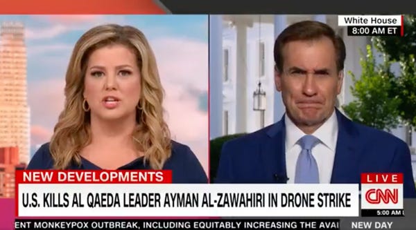 “John Kirby says the US has "visual confirmation" and confirmation through other sources and methods of Al Qaeda leader Ayman al-Zawahiri's death, but no DNA confirmation.”