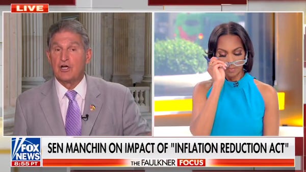 Fox News is REALLY mad at Joe Manchin for being a Democrat who occasionally wrangles deals in backrooms with other Democrats, and they are especially mad at him for coming out in support of whatever Inflation Manchin Houseboat Better bill he negotiated with Chuck Schumer, so that he might receive maximum extra credit for supporting a bill that accomplishes things that are part of the agenda of the president, who is in the same party as he is.