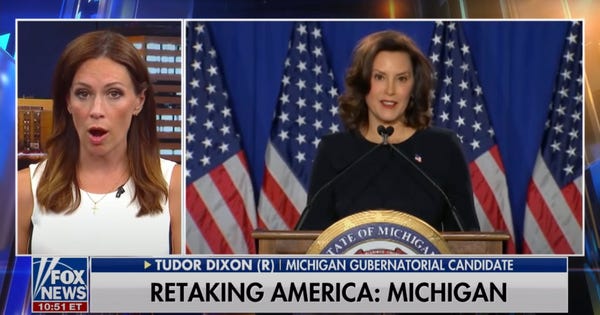 Tudor Dixon — yes, that’s a real person not a New England home style — crushed all comers in the Republican primary for governor. She was the host of "America’s Voice Live" on the Real America’s Voice cable network but otherwise has no relevant political experience, which you might think is important. Michigan is a state and all. However, former Secretary of Education Betsy DeVos, who knows something about lacking basic qualifications for a job, asked Donald Trump to support Dixon because she’s apparently the "only one who can stand toe to toe with” Democratic Gov. Gretchen Whitmer.