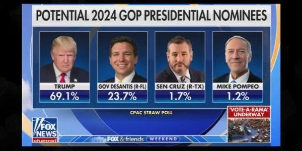 Florida Gov. Ron DeSantis was again a distant second with 23.7 percent support. The aspiring autocrat enjoyed 28 percent support in the February poll. A paltry 1.7 percent of attendees wanted Sen. Ted Cruz as the Republican nominee. Former Secretary of State Mike Pompeo was fourth with 1.2 percent.