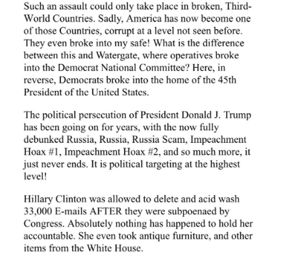 "These are dark times for our nation," he begins somberly, like anyone God loves thinks something inappropriate has happened here. "[M]y beautiful home," he whines, "is currently under siege, raided, and occupied by a large group of FBI agents." They were reportedly there all day. This is what happens when a judge agrees that there is probable cause to believe they'll find evidence of crimes and that they need to go in there and get it now .