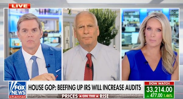 Bernstein told what I’m sure was a receptive Fox News audience: "Here is the thing. You shouldn’t evade your taxes. There is my public service announcement. It is illegal to evade taxes.” He clarified that the IRA will reverse longtime defunding of the IRS, which he called a “shadow tax cut for wealthy tax evaders.” However, it won’t increase the audit rate for families making less than $400,000 a year.