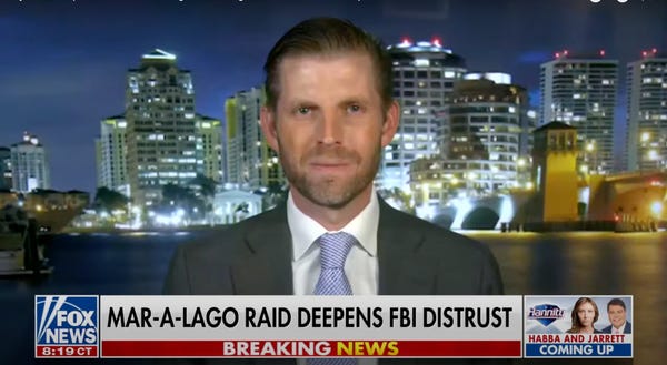 Eric was also appalled that the FBI conducted its search "absolutely, you know, no notice.” It’s not a social call, asshole. The FBI doesn’t show up at your house for crudités.