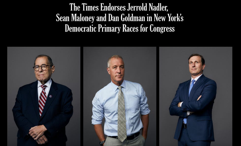 Last week, the New York Times editorial board endorsed candidates in the New York Democratic primaries for Congress. People couldn’t help but notice that Rep. Jerry Nadler, Rep. Sean Maloney, and Dan Goldman are all white cisgender men. New York is a diverse place, especially the districts these candidates would represent. However, this is a pretty diverse slate of white guys. You can tell from the poses in their Times photos: Goldman went with arms folded in deep reflection. Maloney, who thinks Democrats should sound less like Chris Hayes (not a bad idea!), has his sleeves rolled up with his hands in his pockets. Nadler has seized the dignified “Blue Steel” look of hands clasped defensively over crotch. Truly, this is America.