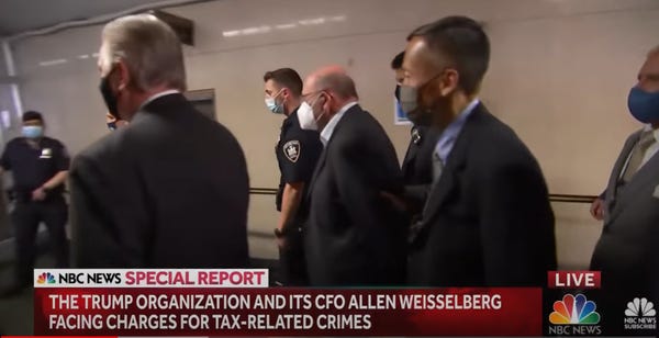 On Tuesday, we wonksplained that Allen Weisselberg, longtime CFO of the Trump Organization, was apparently likely to plead guilty today (Thursday) in the case of all the hinky tax shit he and the Trump Organization apparently cooked up for their own benefit. There are 10 counts in the original indictment that name both Weisselberg and the Trump Organization, and then five more just for him. The counts had names like "SCHEME TO DEFRAUD IN THE FIRST DEGREE."