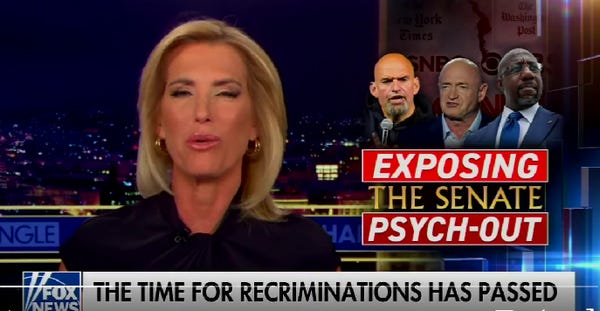 Laura Ingraham is really tired of everybody acting like Republican candidates for Senate are fucking bugfuck stupid crazy losers from stupid bugfuck loser crazy town. Just because they are literally Herschel Walker and that sentient mound of human butthair JD Vance and crudité-munching New Jersey hero Dr. Oz doesn't mean they are not AMAZING and you should not SUPPORT THEM and stop JOINING THE PILE-ON.