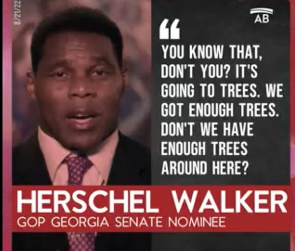 “Blindspot for the right - Herschel Walker blasts climate bill: ‘Don’t we have enough trees around here?’”