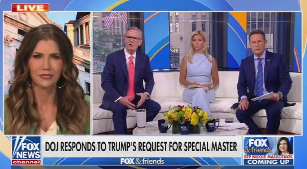 “Steve Doocy to Kristi Noem: "Ultimately, it comes down to why did he have all that secret stuff at Mar-a-Lago? I know his team has said they declassified it, but that's news to the agencies that those documents belong to."”