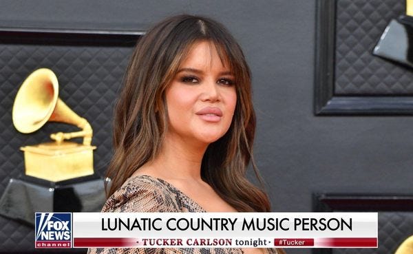 And also the scum of the earth found out. "Lunatic Country Music Person," said the chyron on the Tucker show. And Morris thought it was hilarious and tweeted "#NewProfilePic," kind of like how Wonkette puts it in our Twitter bio when Maggie Haberman attempts to pass judgment on our august website.