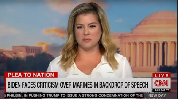 “Whatever you may think of the speech” is Keilar’s attempt at neutrality. Because in this understanding of "neutrality," the "objective" journalist has no opinion one way or another about the existential threat to democracy that Biden discussed. However, she quickly takes an actual position, that it was wrong for Biden appear with uniformed Marines during a “political” speech. (No one would’ve suggested that George W. Bush’s speech after 9/11 was “political.”)