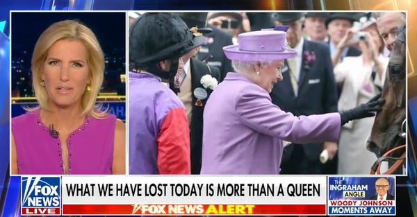 Professional terrible person Laura Ingraham declared the Queen "the gutsiest and most courageous woman of the past 100 years." This is a curious description of a monarch who studiously avoided controversy. That was the whole point. You can love the Queen more than high tea and still recognize that she was hardly an activist.