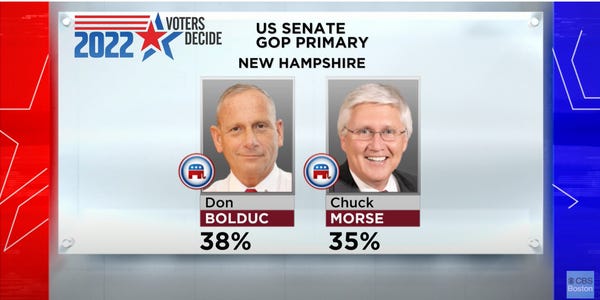 Retired Army Gen. Don Bolduc defeated New Hampshire state Senate President Chuck Morse 38 percent to 35 percent. Sitting Republican Gov. Chris Sununu had endorsed Morse, who you can tell is a RINO because he conceded the race last night without complaint. You can also tell that he prioritizes party over principle because he immediately endorsed Bolduc, an anti-vaxxer and election denier.