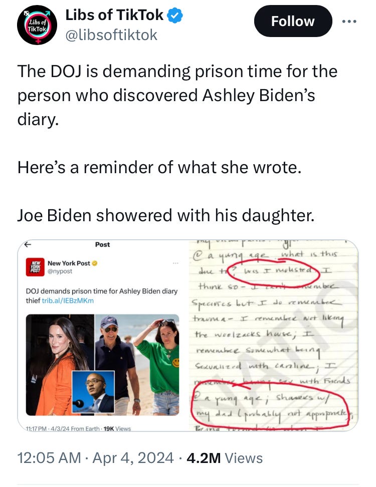All of it makes for gleeful fodder for the rightwing trolls of Twitter and TikTok, who are claiming that the jailtime is extra proof that the diary is real and proves that Ashley and her father Joe showered together in some kind of an inappropriate way, though the entire thing could have been written by Junior at the bar of the Trumpilla or any one of the many grubby hands that touched it along the way for all anyone really knows, unless Ashley ever says otherwise. And Ashley has never said a damn thing.