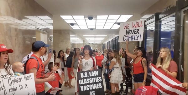 This weekend, we brought you the story of the anti-vaxxer lady who threw a menstrual cup filled with blood at California lawmakers in hopes that this would convince them to let people send their unvaccinated children to school. It should not have gotten more ridiculous then that, but here we are! Because apparently, this protest has now reached the point where all of the very affluent white ladies are comparing their "struggle" to that of the Civil Rights movement — to the point where they are walking down hallways actually singing "We Shall Overcome."