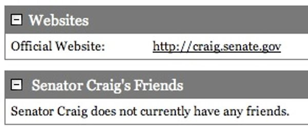 LARRY CRAIG FINALLY HAS INTERNET FRIENDS!One of you noticed Gay Larry Craig had no virtual pals on this FreedomSpeaks site, so a bunch of you people went over there and kindly befriended the Idaho Bathroom Goblin. Who says chivalry is dead? [ FreedomSpeaks ]