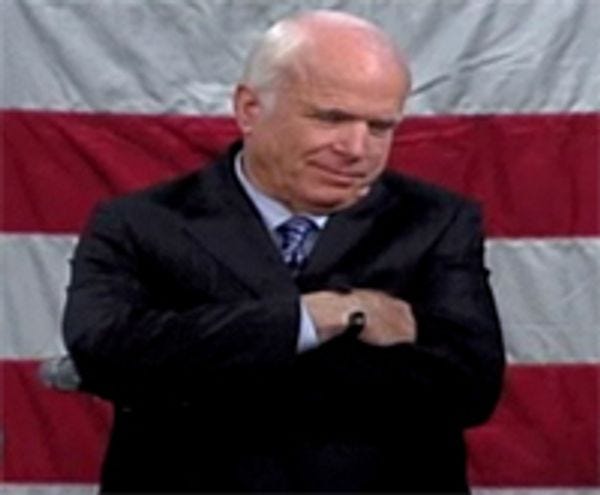 MCCAIN VOLUNTEER CALLS MCCAIN A SLAVEDRIVER: This video at CNN is pretty funny, and we'd embed it here if stupid CNN actually had that feature. Now you will have to make an extra click, suckaz. It's John McCain taking a question from one of his volunteers, a (satirical?) New Yorker who starts gently and proceeds to curse at him for the way he treats his volunteers (like shit). McCain, naturally, interrupts her with several "wisecracks" to lighten the mood. This is his only half-decent political skill, and it fails miserably here, ha ha. [ CNN ]