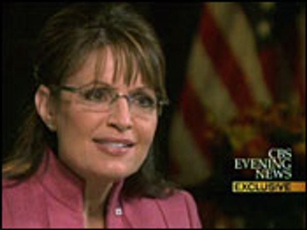 GOOD NEWS FOR YOUR SARAH PALIN: Alaskan nitwit'sdismal interview with Katie Couric maybe wasn't noticed by many, because of McCain's dumb muppet stunt and the, uh, New Great Depression. Ha ha, not really, the whole world watched it on YouTube. [ LA Times ]