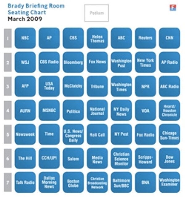 HERE'S A FUN PRESS CORPS GAME CALLED "STEAL POLITICO'S SEAT!"We rather like the anecdotes inthis FiveThirtyEight post about how oppressed bloggers are always trying to stealPolitico's seat at White House press briefings, only to be caught minutes later by confused Politico reporters. This could be a fun daily game! So we ask that reporters take turns stealingPolitico's seat -- one day Sam Stein does it, the next day David Corn, etc. -- and e-mail us the name of Politico reporter who awkwardly kicked you out, and what it was like. [ FiveThirtyEight ]