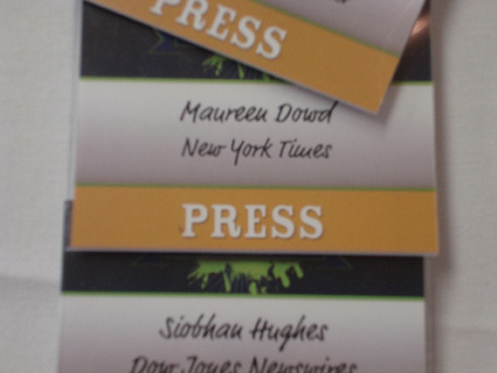 Unclaimed press passes, at the press check-in table, at 7: 00 PM, THE END OF THE CONFERENCE. What's the story,MAUREEN DOWD? Too busy making out with your Pulitzer Prize? ...