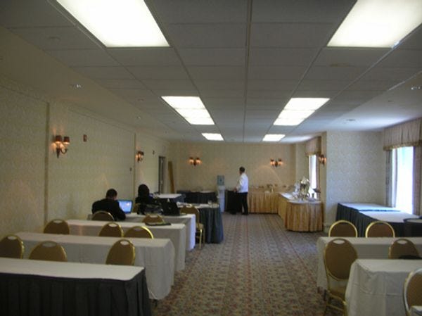 The exclusivePRESS ROOM, busy as a bumble bee. This is where Your Wonkette Correspondent would retreat to for a cup ofORANGE JUICEand a nap, whenever the action got too hairy ...
