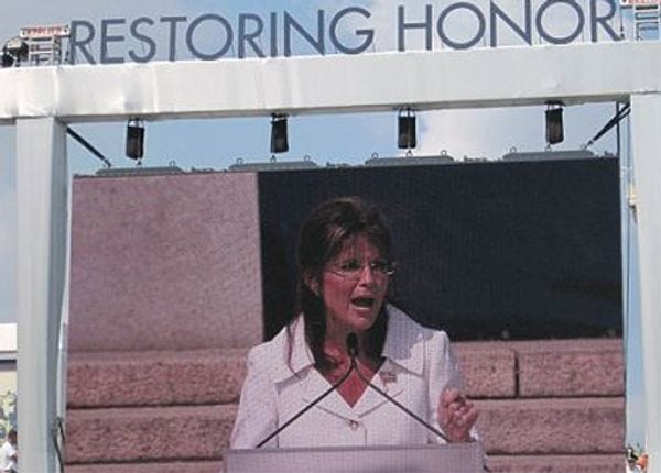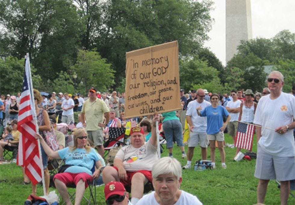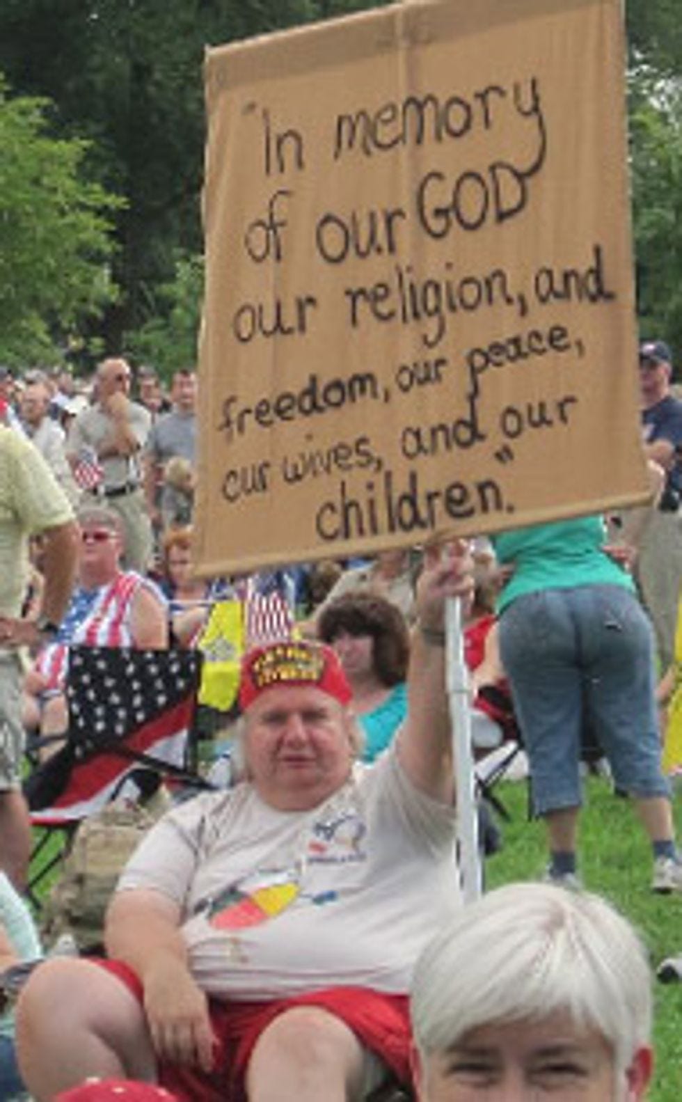 It was Colonial Williamsburg staff day at Glenn Beck's GlennBeckPalooza! Show up in your work uniform and get a 60-pack of Hot Wings for just $4.99! Guess who didn't remember his work costume? Wonkette's new drive-time "shock jock" Riley Waggaman! Are you ready for lots more pictures of the Honor which was Restored by, uh, a weeping lunatic self-promoter from Fox News and amoral snowbilly grifter Sarah Palin? The answer, of course, is "I Haz a Dream!" Let's take a look at the rest of Wonkabout Arielle Fleisher's photo album from America's Worst Summer Festival!
