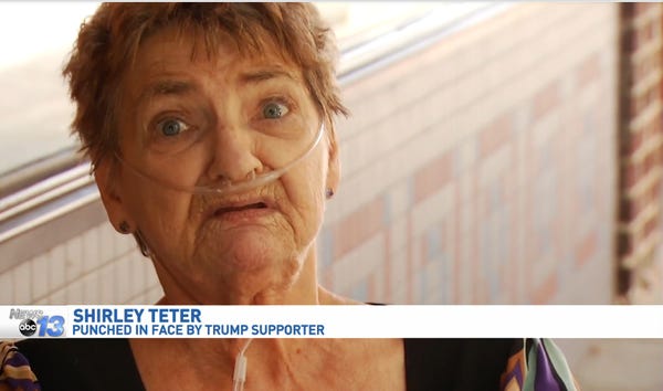 69-Year-Old Lady With Oxygen Tank Cold-Cocked By Trump Dude, For America Obviously