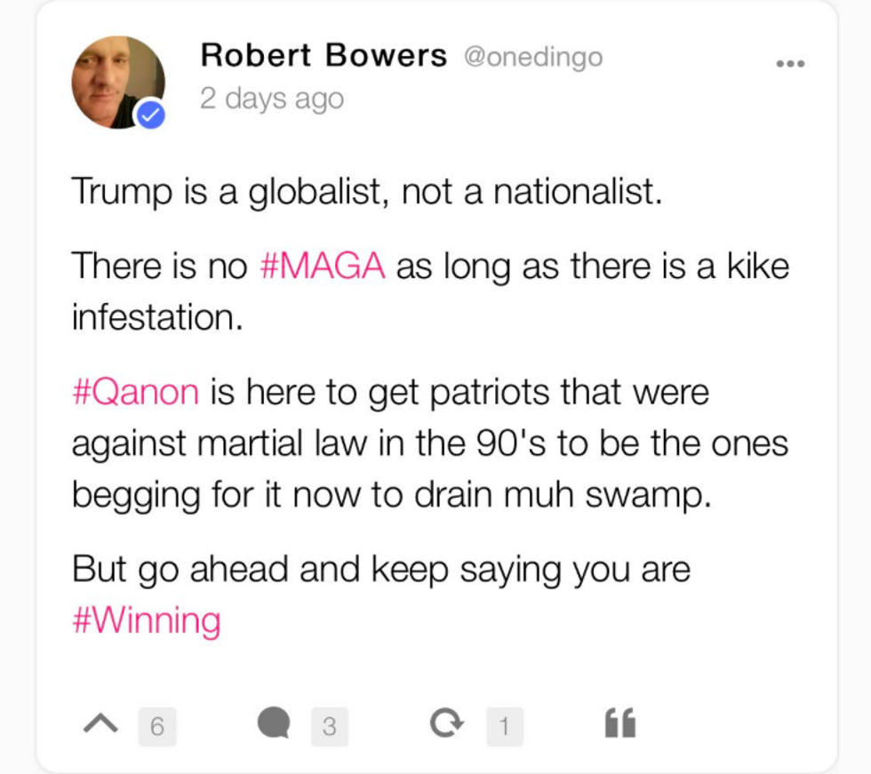 According to people on Twitter who have been listening to the police scanner, the suspect is 46 year old Robert Bowers, an avowed neo-Nazi with a profile on Gab dedicated to how much he hates Jewish people. Note the 1488 number on whatever that thing is in his profile photo. (Update 12: 31pm: CBS has confirmed )