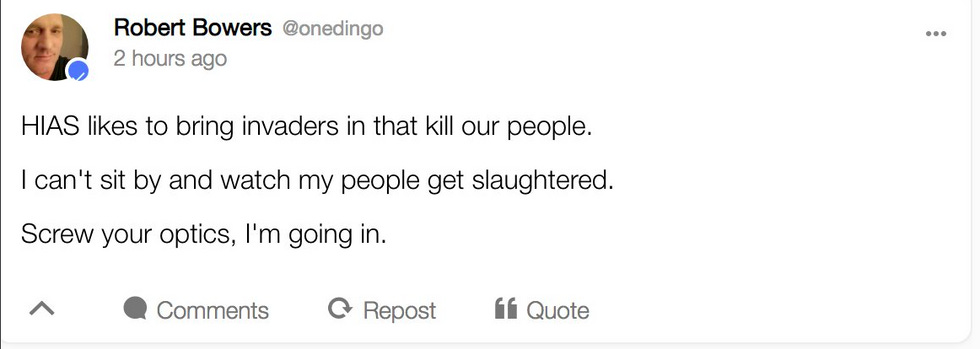 And a closeup of his last post, in which he stated that HIAS (Hebrew Immigrant Aid Society) -- a non-profit dedicated to helping refugees, "likes to bring invaders in that kill our people." He wrote "I can't sit by and watch my people get slaughtered. Screw your optics, I'm going in."