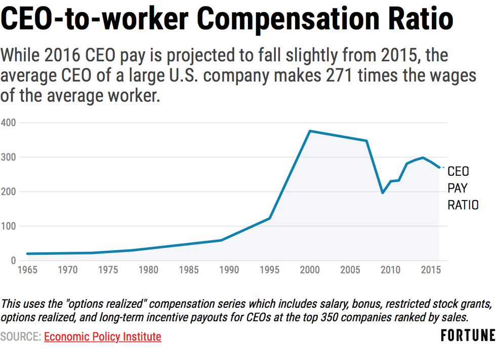 Over the last few decades, the gap between worker pay and CEO pay has increased dramatically. Wages for workers have stagnated, while CEO pay has gone through the roof. This is the direct result of lowering the marginal tax rate.