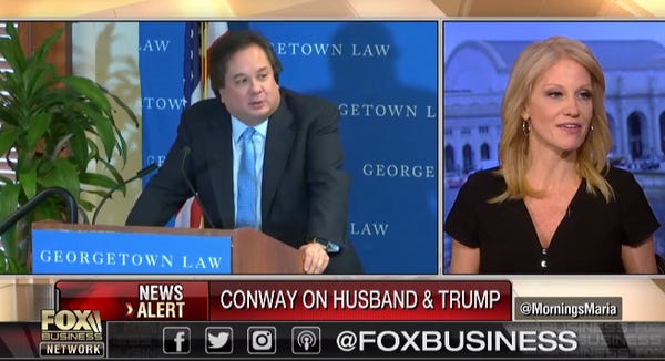 Meanwhile over in Kellyanne Conway's world! KAC went on the Fox Business network to tell Maria Bartiromo about her feelings, and George's feelings, and Dipshit's feelings. On top of throwing constant shade at her husband, who wouldn't be anybody if she wasn't Kellyanne Conway -- in this and every other interview she's giving -- she explained that Trump is having a Mad Cow Disease Moment on Twitter because "he's protective of me," and confirmed that she is "not being asked to choose" between George and Dipshit. She said George does wish she would quit White House, but that that would send a bad message to the feminists. (?)
