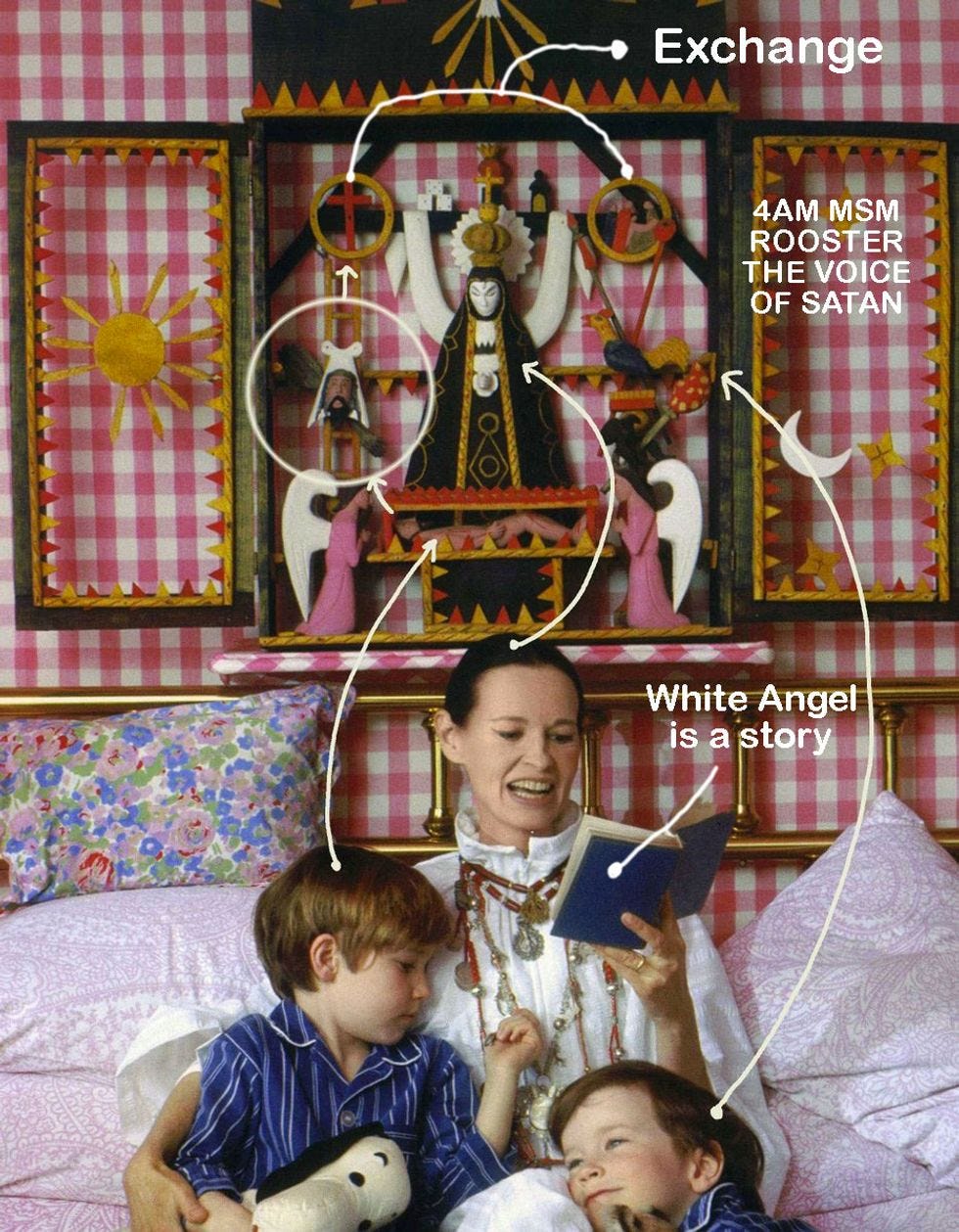 Gloria did not know she was an alter. She knew she had these dreams but she considered herself a deeply spiritual artist. She had all the money in the world to convince her she was gifted. Her family were the chosen. She believed her purpose was to share her artistic vision of pattern and form. She was a trendsetter. Gloria never considered ritualistically killing one of her children. Just like my dog Butter, she had been programmed a long time ago. All she needed was to hear the trigger and she would run the trauma program known as Dark Mother.