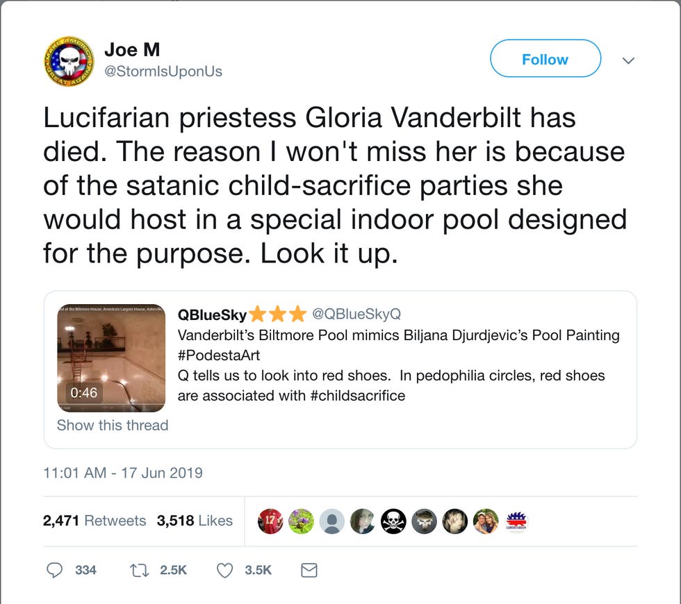 Specifically, they think that Gloria Vanderbilt (like Hillary Clinton) was a "Luciferian priestess" who sacrifices children for their adrenochrome in an empty pool at Biltmore Mansion in North Carolina. "Look it up!" implored a highly retweeted post from "Joe M," aka "StormIsUponUs."