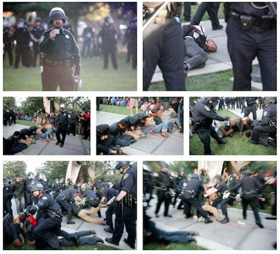 Remember the fat, smug face under that helmet and behind that ridiculous mustache in the picture above. This happened yesterday at UC Davis, a California college in a delightful, sustainable little town between San Francisco and Sacramento -- the kind of place earnest liberals move to, when they have kids, so they can all ride around on the town's famous network of bike paths. It's a well-off town, mostly, and it takes quite a lot of tax money to keep a bunch of vicious thugs overfed and dressed like junior Darth Vaders with their portable hard-ons, on the off-chance some college kids might one day peacefully sit outside to protest this nation's revolting descent.