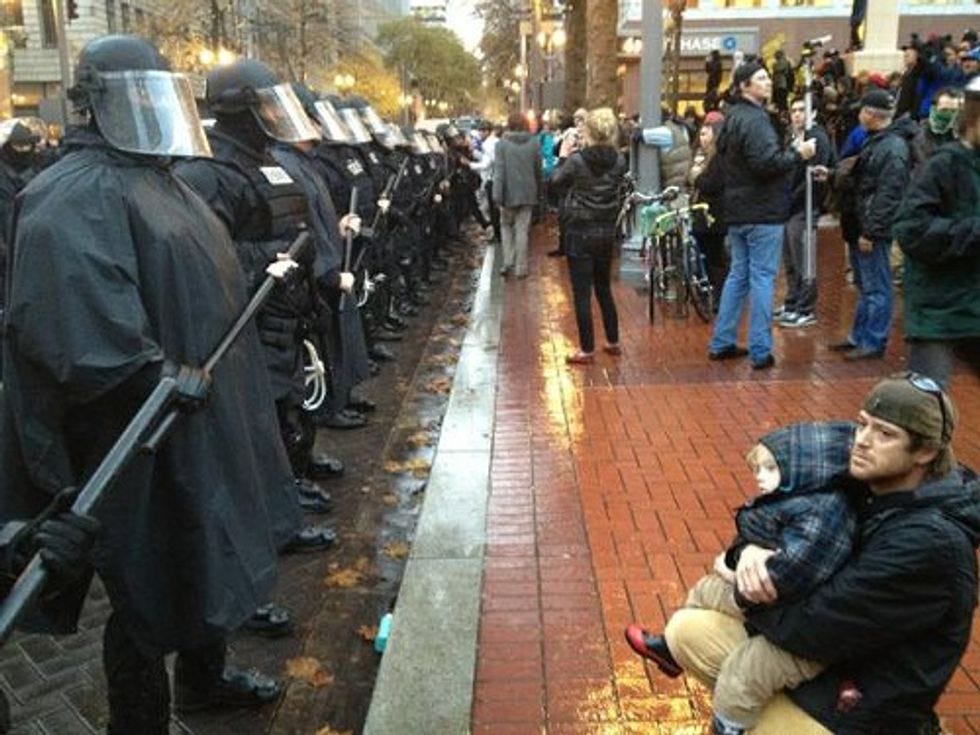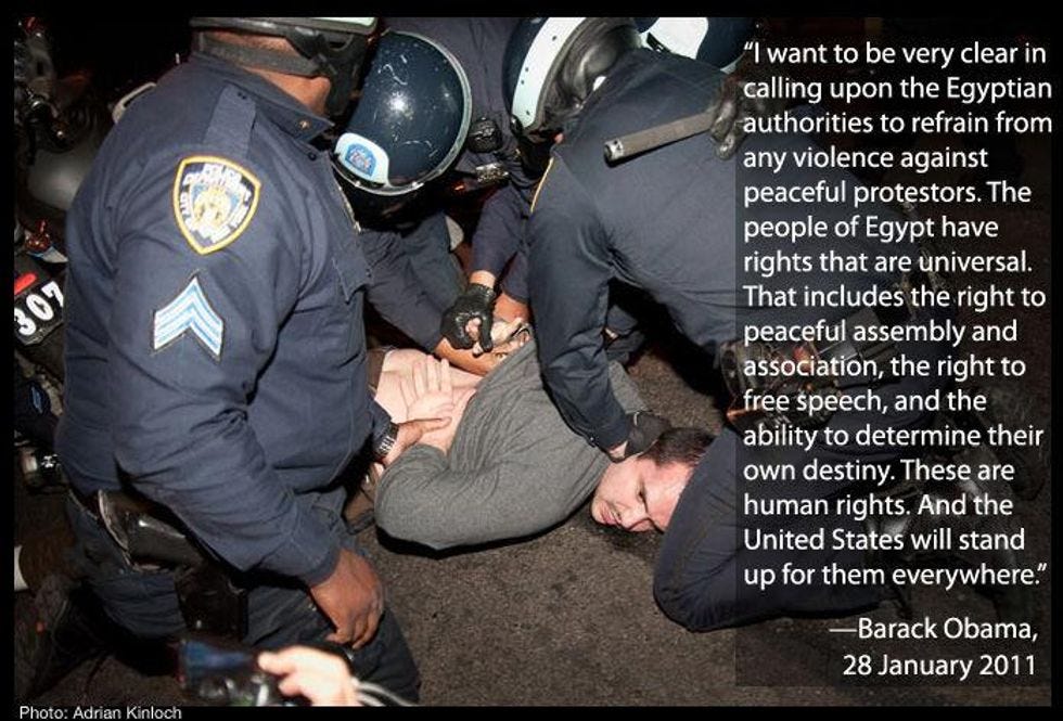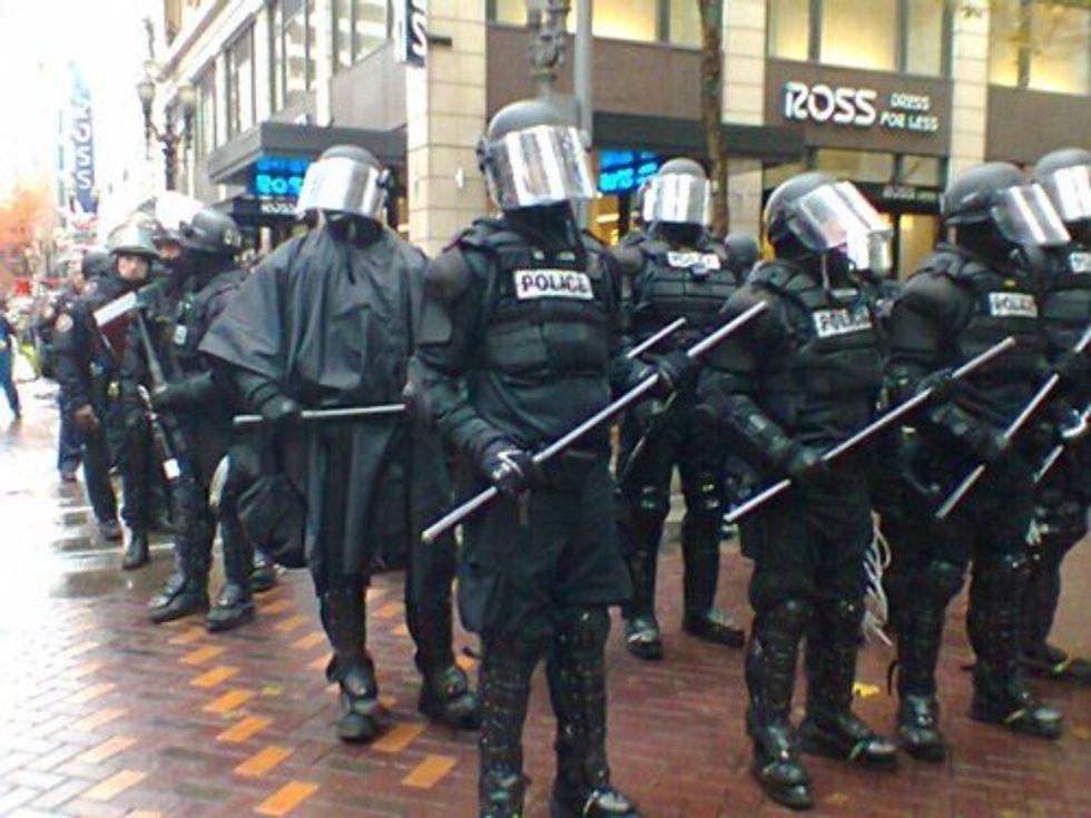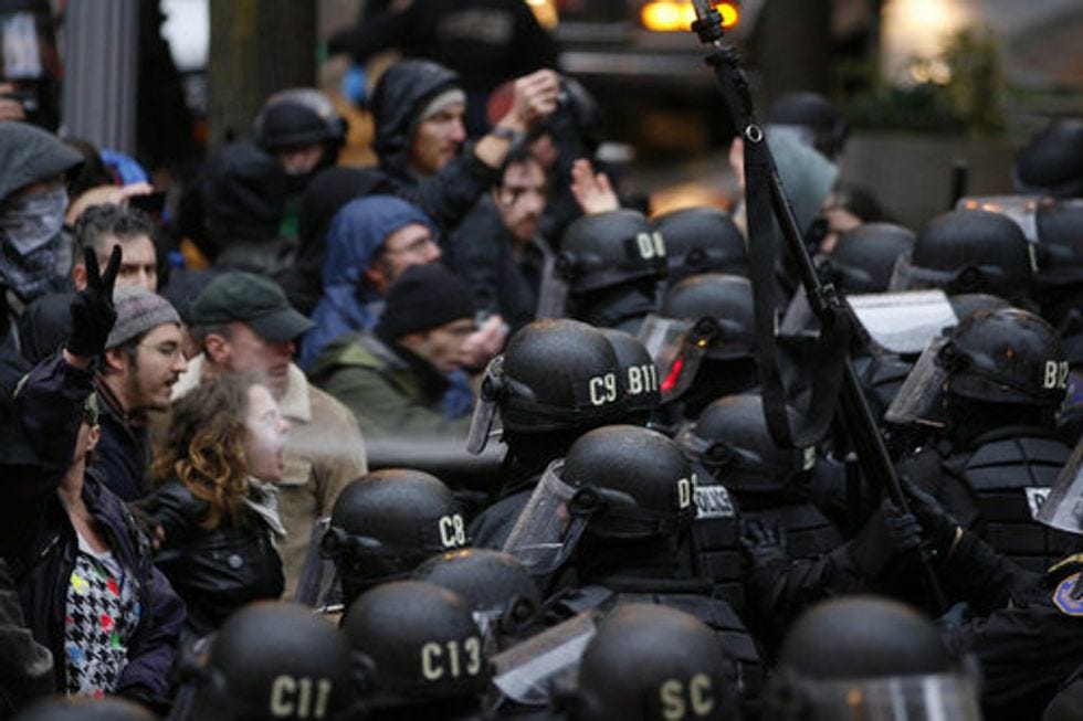 How did America's heavily militarized security guards for the 1% spend the work week? Oh, just pepper-spraying sitting students in the face, macing old ladies, stomping peaceful protesters, yanking women around by their ponytails, destroying libraries and bloodying the faces of America's citizens. You know,what they've dreamed of doing for decades.