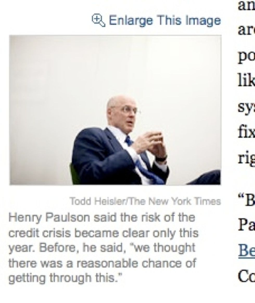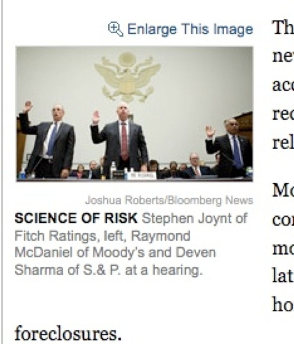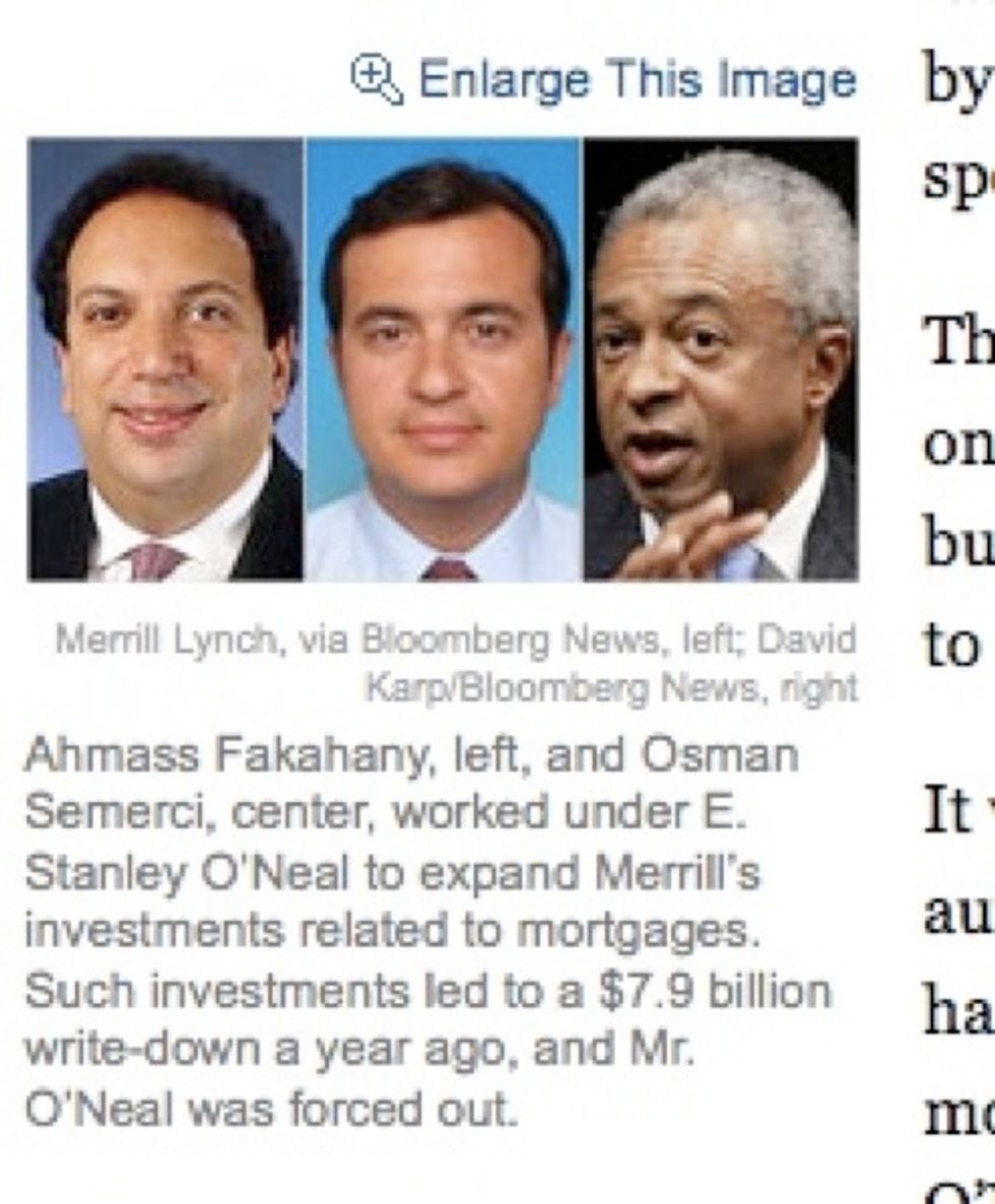 After the economy and capitalism completely died in September because one freaking company called "Lehman Bros." was denied billions of dollars from the Federal Government, the liberalNew York Timeshas been running a weekly-ish series called "The Reckoning" about the various Wall Street jackals -- i-bankers, hedge fund managers, risk-rating companies -- who pooled their talents together to somehow, magically, destroy the entire world with a mere HOUSING PROBLEM. All of the articles in this series are well reported and subtly vilifying. The best part about reading them, though, comes as you scroll down to the fifth or sixth paragraph and see an accompanying picture of some douchebag you've never heard of with a caption describing how this person ruined your life. We've compiled screenshots of these instances from many stories in "The Reckoning" series and blown them up, to heighten the embarrassment.