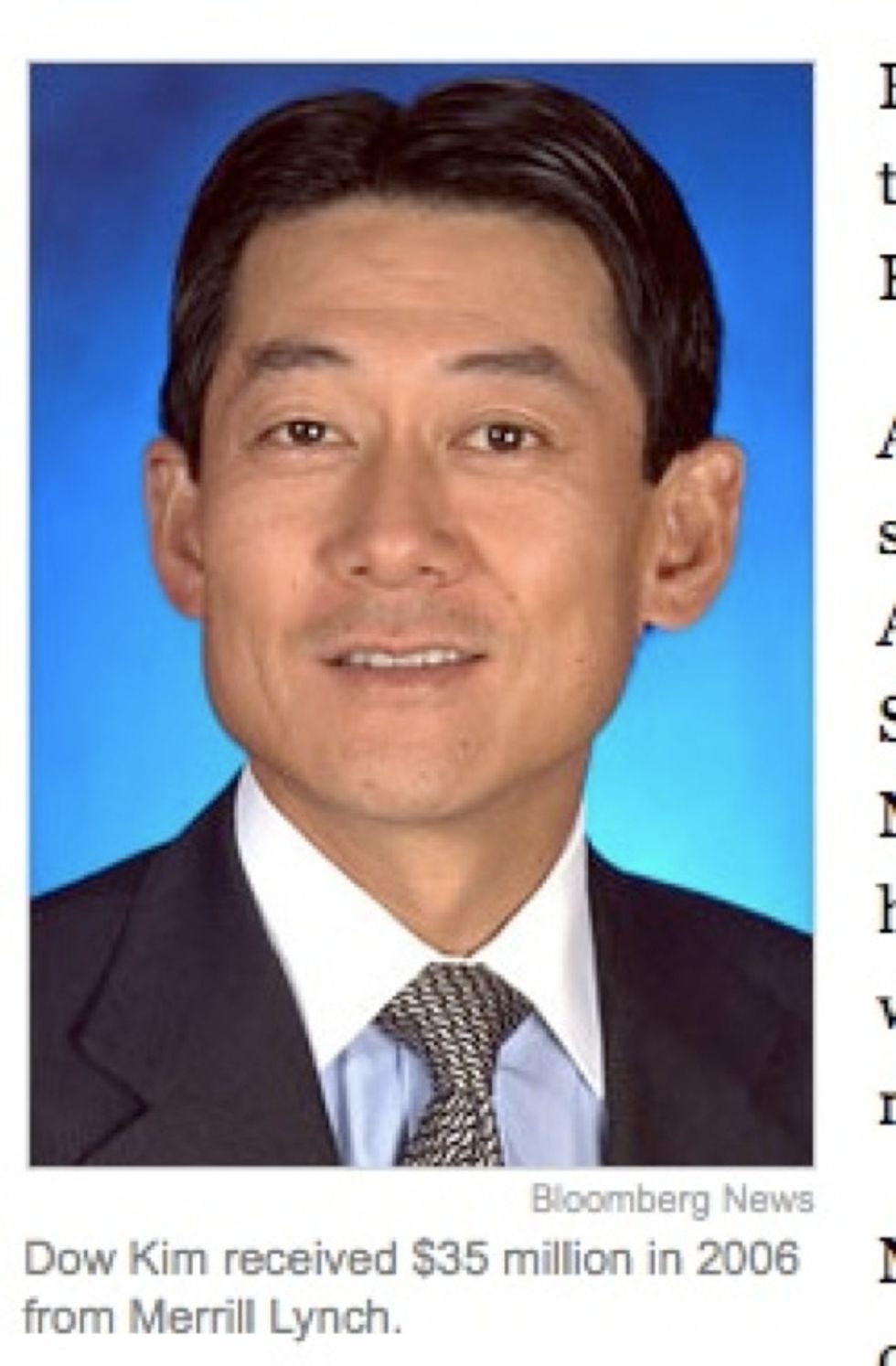 It's Trig! No, it's Dow Kim! He's the topic of today's piece about Merrill Lynch -- specifically, why he ruined it! You wanna know? Read the caption. He could not possibly have gotten that bonus in 2006 if he had acted responsibly! WHY IS DOW KIM SO MISUNDERSTOOD?