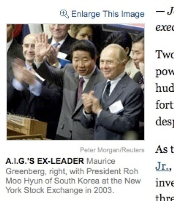 Ah, here's some a-hole whose former company now has $150 billion of your taxpayer money. He is there with a Korean guy at the Palace of Money. Later, he diced up the Korean guy and repackaged him, somehow, into a series of mortgage-backed tranches that his friends invested in synthetically. This murder technique is called a "derivative."