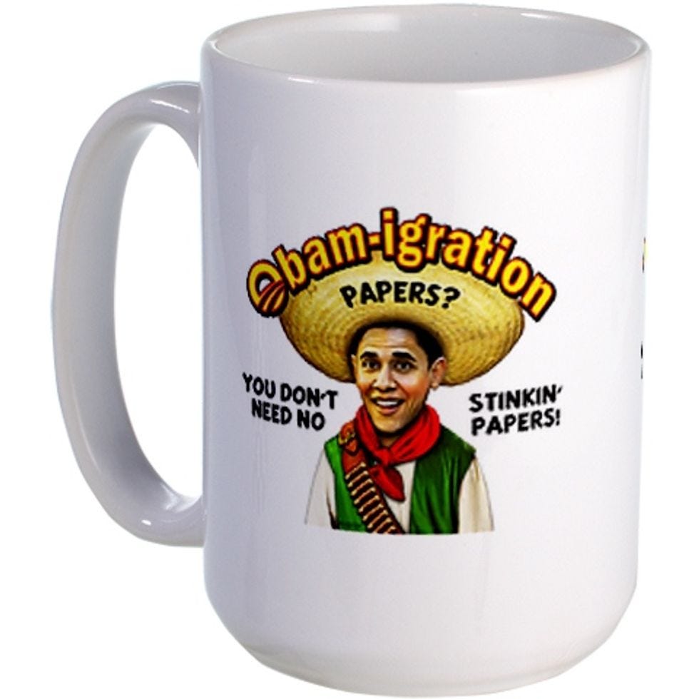 For example, Dads who oppose both Obama and giant sombreros (immigrants often hide under them while they cross the border) can drink their morning cuppajoe in this Obam-igration mug, whose message will help him start his day seething with rage. Ole!: