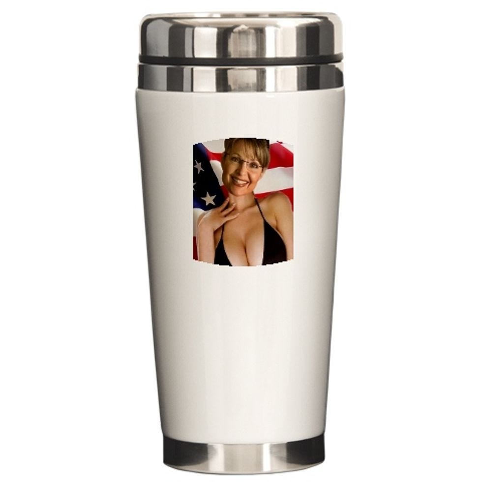 OK, that's enough with the ethnic hatred. Let's talk about love. Who does Dad love? Is it Sarah Palin? Unless your dad is Todd Palin (it's possible, he's quite virile), he just can't fulfill his dream of waking up every morning with Real America's favorite Real Doll in his bed. But he can have his morning coffee with her image, with this Boobgate-y travel mug: