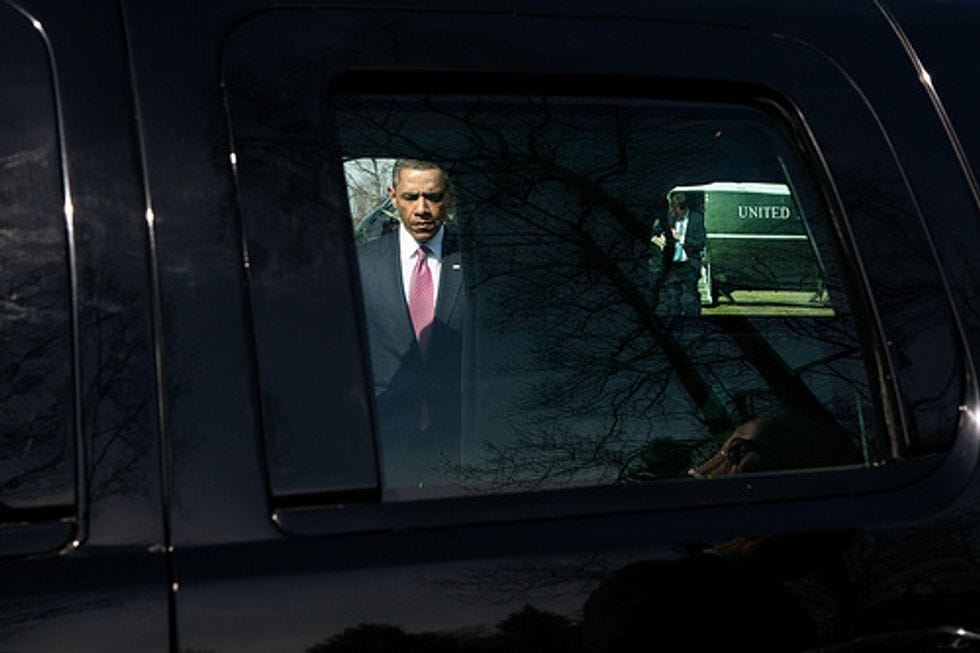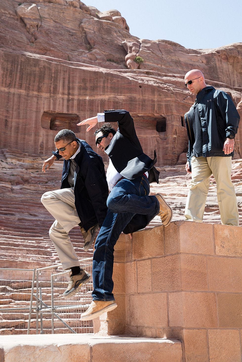 In this picture, is Barack Obama running from Indiana Jones's scary boulder, or is he running across rooftops with his friend Chest Rockwell? We will never know.